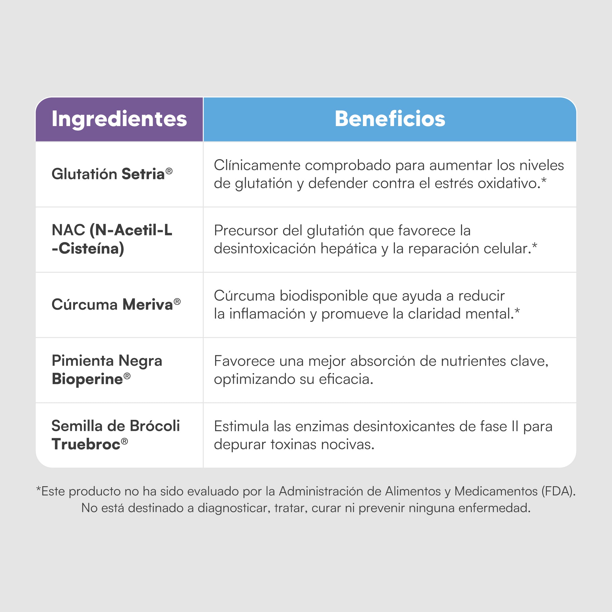 - Incluye Setria® L-Glutatión, una forma patentada y clínicamente estudiada para una absorción superior.